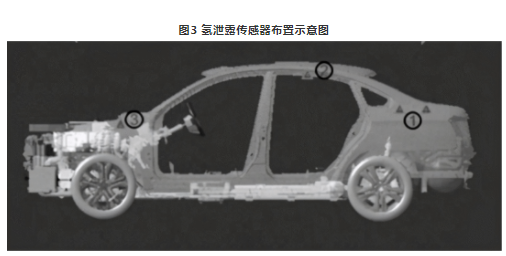 氫泄露傳感器的布置如圖3所示,圖中傳感器布置在了后備箱的最高點①、乘客艙②和前機艙③附近,有的傳感器布置方案也在儲氫瓶口處增設(shè)氫傳感器。