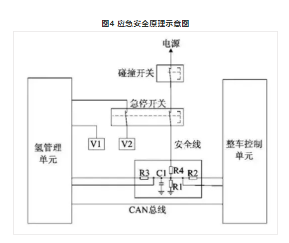 圖中的應(yīng)急安全硬線裝置由碰撞開關(guān)、急停開關(guān)、氫系統(tǒng)控制器控制端和整車控制控制端等四個端口同時控制,實際應(yīng)用中控制端口也可以按照相同的原理增加或減少。
