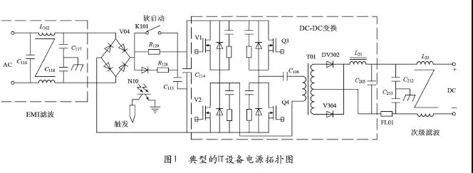 典型的IT設(shè)備內(nèi)嵌電源PSU工作原理如圖1所示(最新的IT設(shè)備電源已經(jīng)采用了LLC電路和輸出同步整流技術(shù),使效率更高)。當(dāng)220V/50Hz的外部交流電源進(jìn)入IT設(shè)備后,首先進(jìn)入IT設(shè)備的PSU電源模塊,經(jīng)EMI、AC/DC整流、PFC、帶高頻隔離變壓器的DC-DC變換器、輸出濾波等環(huán)節(jié)變成DC12V后(部分IT還有5V和3V),才向IT設(shè)備的芯片、電路板及風(fēng)扇等供電。這一過(guò)程通常有高達(dá)±20%以上的輸入電壓/頻率運(yùn)行范圍(目前很多此類(lèi)電源還兼容直流輸入)、近0.95的輸入PFC和小于3%的THDi(參數(shù)來(lái)源IntelServerSystemH2000WPfamily),并會(huì)過(guò)濾掉輸入電壓中存在的諸如電壓失真、噪聲干擾、沖擊電壓等供電質(zhì)量問(wèn)題。同時(shí)IT設(shè)備電源還有一定的輸入斷電耐受時(shí)間,如ATX標(biāo)準(zhǔn)要求當(dāng)輸入斷電時(shí),12V輸出Hold-up時(shí)間最小為17ms,而SSI標(biāo)準(zhǔn)則要求超過(guò)20ms,而IntelServer標(biāo)準(zhǔn)要求這一時(shí)間為13ms。IT設(shè)備對(duì)輸入電壓、頻率、電流的寬泛要求,為數(shù)據(jù)中心供電制式的變革提供了第二個(gè)必要的前提。