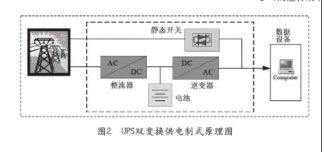 早期的IT負(fù)載對(duì)供電品質(zhì)要求較高,是UPS雙變換供電制式成為目前數(shù)據(jù)中心使用時(shí)間最長(zhǎng)、應(yīng)用最廣、認(rèn)知最深的供電制式的價(jià)值所在。其供電系統(tǒng)圖及工作路徑如圖2所示。