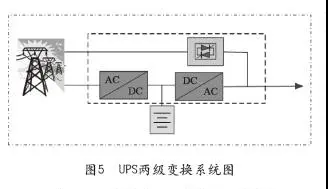 HVDC在初期推廣宣傳時(shí)非常強(qiáng)調(diào)其“一級(jí)變換”理論,宣稱(chēng)比UPS效率高的原因是只需要AC/DC的一級(jí)變換,而不象UPS需要AC/DC和DC/AC的兩級(jí)變換,所以具有更高的運(yùn)行效率,其常用的比較拓?fù)淙鐖D4和圖5所示。