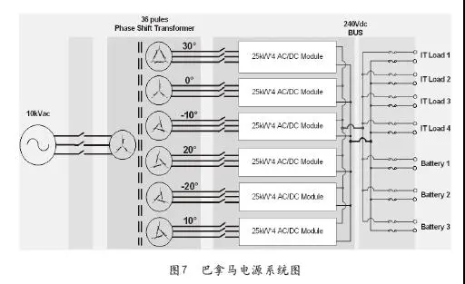 巴拿馬電源供電制式的主要?jiǎng)?chuàng)新可總結(jié)為三點(diǎn):首次把10kV中壓變壓器、HVDC組合成一體的供電系統(tǒng);通過(guò)采用36脈沖中壓移相變壓器,優(yōu)化了HVDC的拓?fù)?將HVDC模塊的變換級(jí)從原先的三級(jí)變?yōu)閮杉?jí),使AC10kV輸入端到DC276V輸出端的多級(jí)變換電源系統(tǒng)效率提升至97%(99%變壓器效率*97%優(yōu)化的HVDC效率);同時(shí)將單系統(tǒng)的交付能力從原先HVDC的1200A提升到1.2MW。