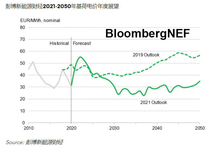 彭博新能源財(cái)經(jīng)預(yù)計(jì),德國基荷電價(jià)在2022年達(dá)到55歐元/兆瓦時(shí)的峰值后回落,到2050年名義電價(jià)下降37%,降至35歐元/兆瓦時(shí)。電價(jià)下滑主要出現(xiàn)在2020-2030年后期。2030年后,電價(jià)在22至35歐元/兆瓦時(shí)之間波動。