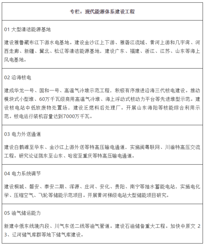 “十四五”規(guī)劃綱要首次設(shè)立能源安全指標(biāo),并作為約束性指標(biāo)納入五年規(guī)劃主要指標(biāo)。綱要草案提出構(gòu)建現(xiàn)代能源體系,推進(jìn)能源革命,建設(shè)清潔低碳、安全高效的能源體系,提高能源供給保障能力;實(shí)施能源資源安全戰(zhàn)略,堅(jiān)持立足國內(nèi)、補(bǔ)齊短板、多元保障、強(qiáng)化儲(chǔ)備,完善產(chǎn)供儲(chǔ)銷體系;落實(shí)2030年應(yīng)對(duì)氣候變化國家自主貢獻(xiàn)目標(biāo),制定2030年前碳排放達(dá)峰行動(dòng)方案,錨定努力爭取2060年前實(shí)現(xiàn)碳中和;開展智慧能源重點(diǎn)領(lǐng)域試點(diǎn)示范,建設(shè)低碳城市;優(yōu)化能源開發(fā)布局和運(yùn)輸格局,加強(qiáng)能源資源綜合開發(fā)利用基地建設(shè)等。規(guī)劃綱要原文中能源相關(guān)要點(diǎn)如下: