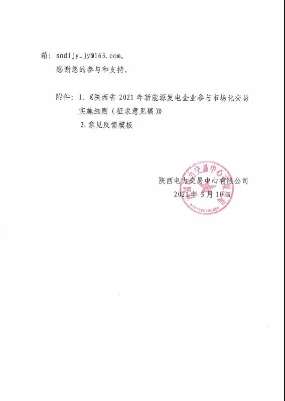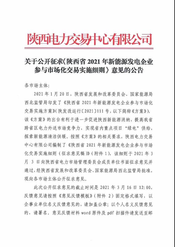 關(guān)于公開(kāi)征求《陜西省2021年新能源發(fā)電企業(yè)參與市場(chǎng)化交易實(shí)施細(xì)則》意見(jiàn)的公告
