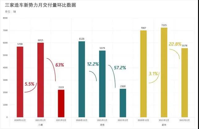 進入2021年,理想1月出現(xiàn)了超過12%的交付量負增長,2月環(huán)比的跌幅更是超過了57%,開年兩個月環(huán)比連續(xù)下滑。此外,小鵬2月份的的環(huán)比降幅也超過60%。