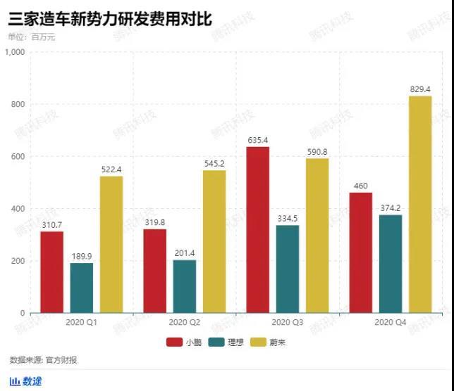 有觀點認為,高額的研發(fā)費用是當前三家新勢力造車企業(yè)未能實現(xiàn)自我“造血”的原因之一。財報數(shù)據(jù)顯示,蔚來、理想、小鵬在2020年的研發(fā)投入分別約為24.90億元、11.00億元、17.26億元。