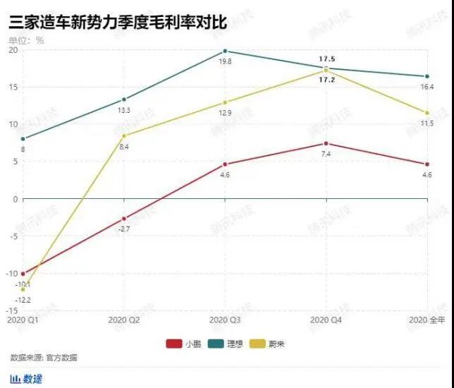 具體來看,在2020年,蔚來四個季度的毛利率分別為-12.2%、8.4%、12.9%、17.2%;小鵬四個季度的毛利率分別為-10.1%、-2.7%、4.6%、7.4%,均保持穩(wěn)定上升態(tài)勢。