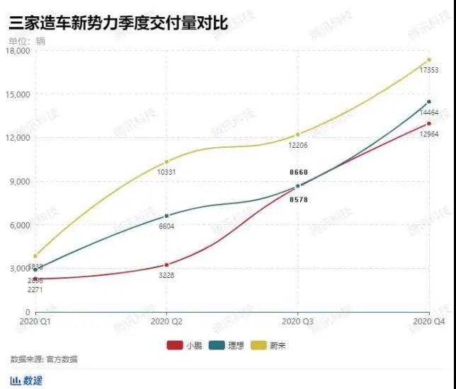 此后疫情得到有效控制,代工廠全面復工后,三家造車新勢力的生產(chǎn)節(jié)奏步入正軌,肉眼可見的是三家車廠在交付量上的穩(wěn)步增長。到了2020年最后一個季度,三家車企共計交付超44000輛的汽車,平均交付量近15000輛。