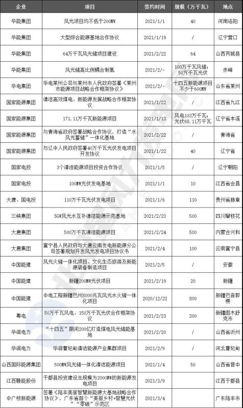 2021年開年至今,短短不足3個(gè)月,國(guó)家電投、大唐、國(guó)家能源集團(tuán)、華能等央企持續(xù)加大對(duì)新能源項(xiàng)目的投資力度。其中,風(fēng)光水火互補(bǔ)、風(fēng)光火儲(chǔ)一體化項(xiàng)目等綜合能源基地項(xiàng)目的簽約成為“十四五”開年的重頭戲。