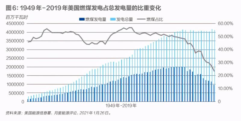 除消費(fèi)總量的結(jié)構(gòu)優(yōu)化外,為二氧化碳排放達(dá)峰做出重要貢獻(xiàn)的還有發(fā)電行業(yè)。美國(guó)能源消費(fèi)的第一大戶(hù)是發(fā)電部門(mén),2019年占能源消費(fèi)總量的37.03%。從1949年美國(guó)能源信息署有統(tǒng)計(jì)數(shù)據(jù)開(kāi)始直到2015年,煤炭一直是美國(guó)發(fā)電用能的第一大來(lái)源,但從2016年起天然氣成為第一大發(fā)電用能源,所占的比重不斷提高,2020年高達(dá)40%,可再生能源為21%,核電為19%,煤炭只占19%。