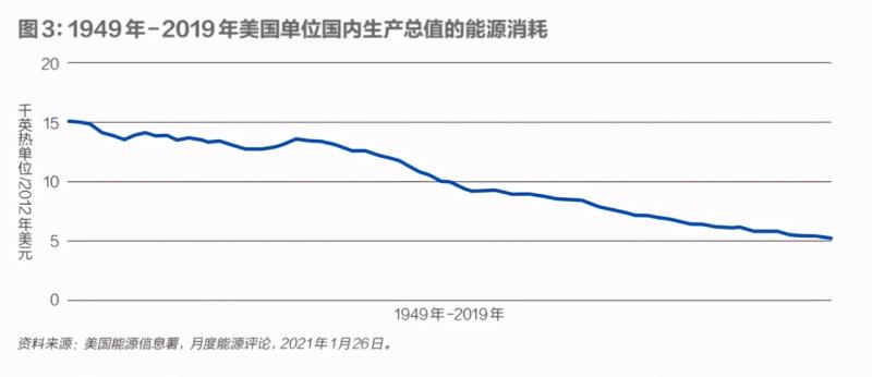 按2012年美元計(jì)算,1949年美國(guó)每美元實(shí)際GDP的能源消耗為15180英熱單位。20世紀(jì)50年代至70年代中期,美國(guó)單位GDP能耗徘徊在14000至13000英熱單位之間。1985年,下降至9600英熱單位,此后下降速度加快。2019年,美國(guó)單位GDP能耗僅為5250英熱單位,僅為1949年的34.58%。