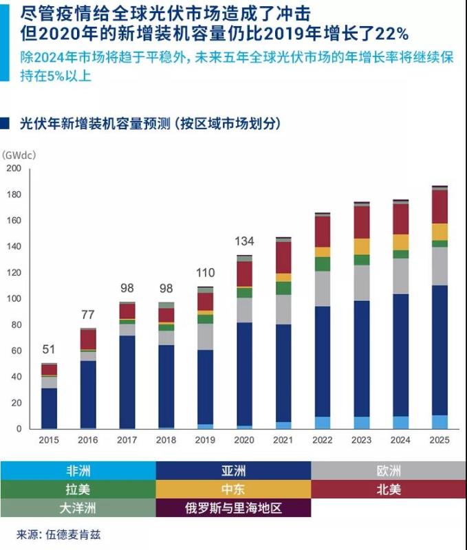 全球光伏市場持續(xù)面臨新冠肺炎疫情帶來的挑戰(zhàn)。2020年全球光伏市場的表現(xiàn)好于預期,新增裝機容量達到134GWdc,較2019年同比增長22%。幾乎所有國家都解除了最嚴格的封鎖措施,目前項目建設仍得以按計劃推進。預計至2025年,光伏市場年度新增裝機容量都將持續(xù)增長,最高將達到187GWdc。唯一的例外是2024年,年增長率低于5%,主要原因在于著美國投資稅收抵免(ITC)政策延期放緩,本土光伏市場增速也將放緩。