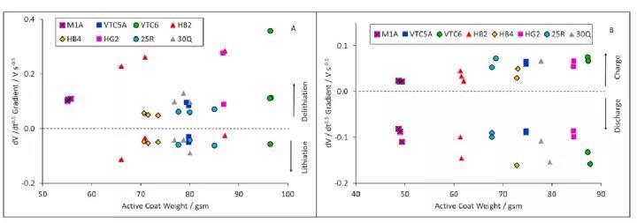 在初始電阻增加后,電極開(kāi)始受擴(kuò)散限制;對(duì)于擴(kuò)散受限過(guò)程,電極電壓與t0.5成正比,進(jìn)而可計(jì)算有效擴(kuò)散系數(shù)(梯度)。如果是在固定的充電狀態(tài)下進(jìn)行,那么梯度(dE/dt0.5)應(yīng)該與電流成比例。電壓與t0.5的線性圖顯示了在±20 脈沖瞬態(tài)線性區(qū)域內(nèi)電壓相對(duì)于t0.5的梯度 (不包括48G電池的結(jié)果,其梯度遠(yuǎn)高于其他電池)。電壓與t0.5的梯度是從瞬態(tài)的初始線性段計(jì)算出來(lái)的。與ASI值不同的是,電壓與t0.5的梯度值在脈沖充放電時(shí)是不對(duì)稱的,對(duì)負(fù)極來(lái)講,鋰化時(shí)的梯度值比脫鋰時(shí)??;對(duì)于正極,充電時(shí)的梯度值小于放電時(shí)的值。