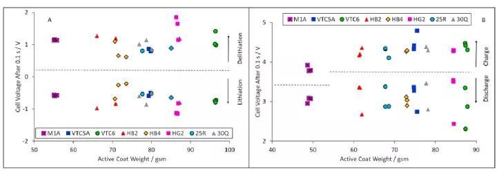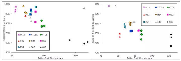 分析充放電速率的一種簡(jiǎn)易方法是繪制2C的放電容量與C/5容量的比值。如圖二所示:每種類型的電極至少制成了三個(gè)電池來(lái)進(jìn)行測(cè)試。這些點(diǎn)的分布表明,涂層重量和功率容量都有變化。這九種負(fù)極 (從M1A到48G)的2C/ C/5的容量比隨著涂層重量的增加有明顯的線性趨勢(shì)。擁有高功率: 能量比的電池通常具有較低的面積比容量,這與較低的涂層質(zhì)量有關(guān)。三星48G電池具有最大的能量密度,因此有最高的涂層質(zhì)量,和最差的2C快充性能。正極也展現(xiàn)了類似的2 C: C/5容量比與活性涂層質(zhì)量的關(guān)系:48G正極具有迄最高的涂層重量??傮w而言,正極的2C: C/5比值要比負(fù)極的低。