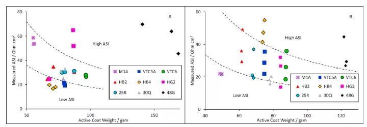 圖三:九種不同電池中拆解出來(lái)電極A)負(fù)極和B)正極進(jìn)行ASI測(cè)試