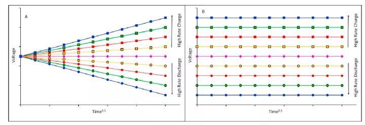 圖一:不同倍率下的GITT限制反應(yīng)測(cè)試A)擴(kuò)散受限。B)電阻有限