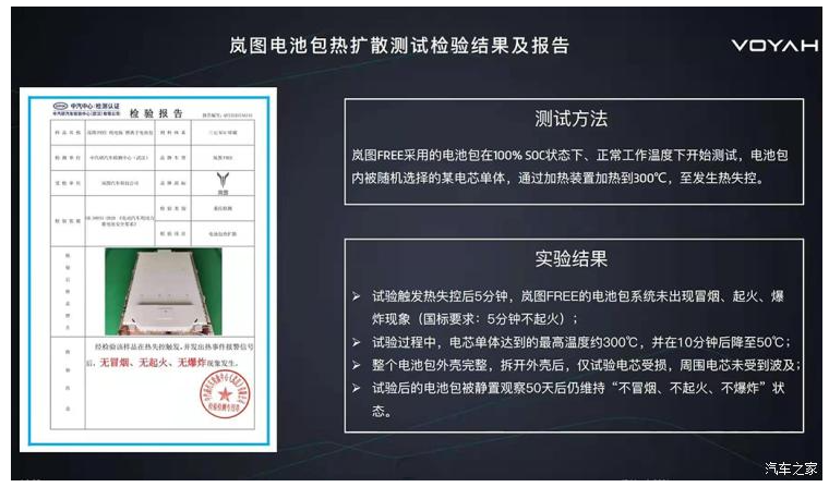 至于一些測(cè)試結(jié)果,嵐圖汽車稱嵐圖FREE電池包按照新國標(biāo)要求進(jìn)行熱擴(kuò)散試驗(yàn),在100%SOC狀態(tài)下、正常工作溫度下開始測(cè)試,電池包被隨機(jī)選擇的某電芯單體,通過加熱裝置加熱到300℃,至發(fā)生熱失控。結(jié)果是試驗(yàn)觸發(fā)熱失控5分鐘后,電池包系統(tǒng)未出現(xiàn)冒煙、起火、爆炸現(xiàn)象;試驗(yàn)過程中,電芯單體達(dá)到的最高溫度約300℃,并在10分鐘后降至50℃;整個(gè)電池包外殼完整,拆開外殼后,僅試驗(yàn)電芯受損,周圍電芯未受到波及;試驗(yàn)后的電池包被靜置觀察,50天后仍維持“不冒煙、不起火、不爆炸”狀態(tài)。