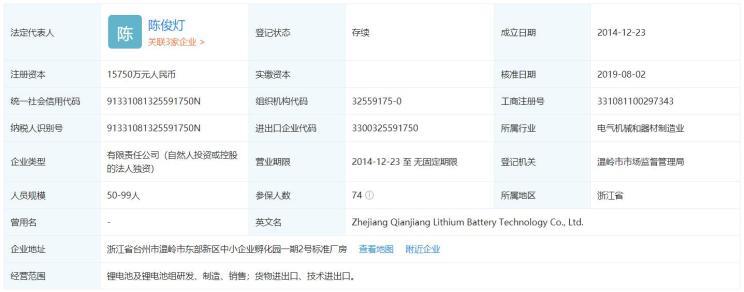 據(jù)企查查信息顯示,錢江鋰電經(jīng)營(yíng)范圍包括鋰電池及鋰電池組研發(fā)、制造、銷售;貨物進(jìn)出口、技術(shù)進(jìn)出口。公司成立于2014年12月,注冊(cè)資本為1.575億人民幣,法定代表人陳俊燈。旗下產(chǎn)品包括軟包電芯系列、圓柱電芯系列、智能電源E-Power三大系列。
