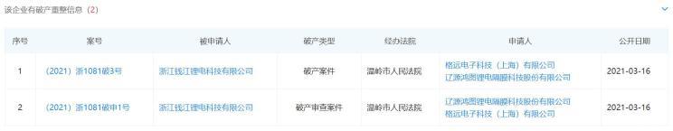 近日,浙江錢江鋰電科技有限公司(以下簡(jiǎn)稱“錢江鋰電”)新增2條破產(chǎn)重整信息,案號(hào)分別為(2021)浙1081破申1號(hào)、(2021)浙1081破3號(hào),均由溫嶺市人民法院經(jīng)辦。申請(qǐng)人為遼源鴻圖鋰電隔膜科技股份有限公司、格遠(yuǎn)電子科技(上海)有限公司,被申請(qǐng)人為錢江鋰電。
