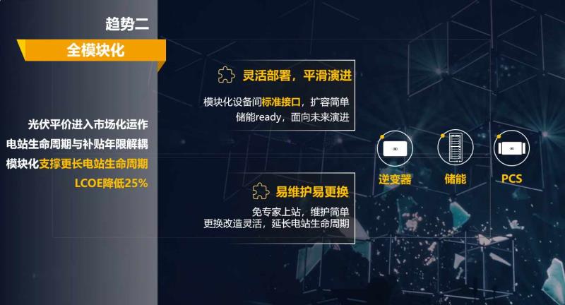 逆變器、PCS、儲能等關(guān)鍵核心部件,設(shè)備間采用標(biāo)準(zhǔn)接口,靈活擴(kuò)容,快速部署;逆變器不管交流還是直流側(cè),具備儲能接口,面向未來演進(jìn)。同時隨著光伏電站規(guī)模和復(fù)雜度越來越高,專家上站維護(hù)的傳統(tǒng)模式成本過高。模塊化設(shè)計可以實現(xiàn)免專家維護(hù),極大降低運維成本、提升系統(tǒng)可用度。全模塊化設(shè)計將成為行業(yè)主流。