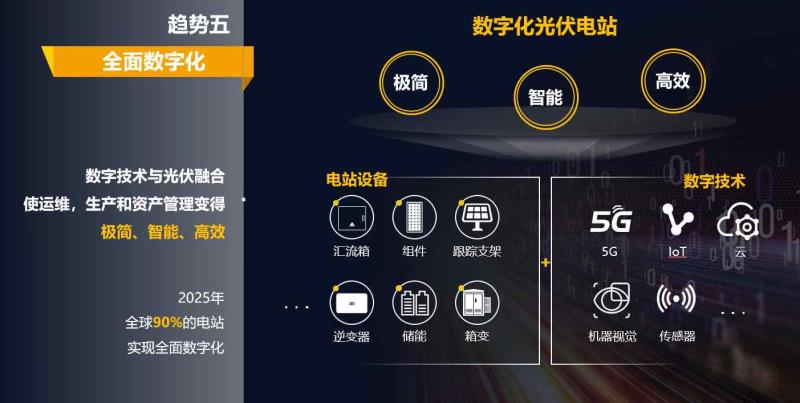 數(shù)字化是智能化基礎(chǔ)。隨著5G、云等數(shù)字化技術(shù)快速演進(jìn),預(yù)計2025年將有90%以上的電站實現(xiàn)全面數(shù)字化,讓光伏電站極簡、智能、高效的管理成為可能,從一個啞電站變成一個有機(jī)的智能生命體。
