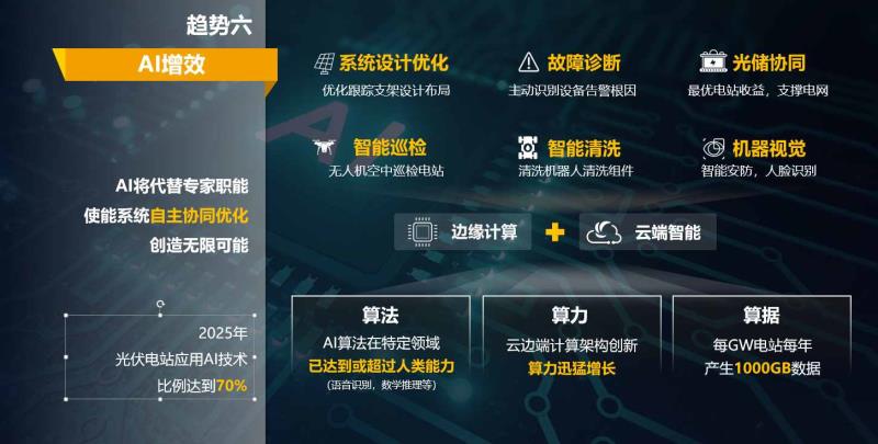 人工智能AI賦能光伏,從萬物互聯(lián)到萬物智能。受益于人工智能及物聯(lián)網(wǎng)技術(shù),通過集成海量的專家經(jīng)驗和不斷的自學(xué)習(xí),讓算法、算力、算據(jù)在計算中發(fā)揮最大作用,AI將很大程度上代替運維專家進(jìn)行診斷決策。通過智能跟蹤算法,讓組件、支架、逆變器協(xié)同運行,找到最佳角度,釋放最大潛力。智能IV診斷,精準(zhǔn)定位故障,將運維工作量從“月”降低到“分鐘”。無人機(jī)空中巡檢電站、清洗機(jī)器人清洗組件、智能安防和人臉識別等技術(shù),使光伏電站不斷完善系統(tǒng)設(shè)計優(yōu)化、故障診斷、光儲協(xié)同、智能巡檢、智能清洗、機(jī)器視覺,全面提升發(fā)電效率和重構(gòu)運維體驗。從而助力電站生產(chǎn)力和安全性提升。預(yù)計,2025年光伏電站應(yīng)用AI技術(shù)比例達(dá)到70%。