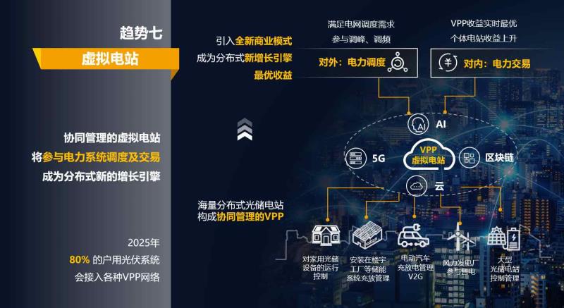 5G、區(qū)塊鏈、云服務(wù)等ICT技術(shù)的大規(guī)模應(yīng)用于分布式電站,組成協(xié)同管理的虛擬電站(VirtualPowerPlant)參與到電力系統(tǒng)的調(diào)度、交易與輔助服務(wù)中。未來5年,虛擬電站技術(shù)的發(fā)展會在分布式光伏場景中衍生出新的商業(yè)模式,以及新的市場參與者,成為分布式新的增長引擎。預(yù)計2025年,80% 的戶用光伏系統(tǒng)會接入各種VPP網(wǎng)絡(luò)。