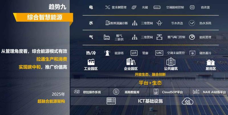 能源結(jié)構(gòu)轉(zhuǎn)向新一代綜合能源系統(tǒng)。從管理角度看,綜合能源模式會有效拉通生產(chǎn)和消費,助力實現(xiàn)碳中和,推廣價值更高。綜合能源是源-網(wǎng)-荷-儲一體化的自治系統(tǒng),需要以ICT基礎(chǔ)設(shè)施為底座,通過平臺+生態(tài)理念,融合創(chuàng)新,提升能源利用效率,降低能源成本。2025年,超融合能源架構(gòu)會大行其道。