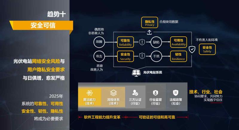 在硬件端除了高可靠設(shè)計及制造外,同時加強(qiáng)預(yù)測性維護(hù),夯實可靠地基;在軟件端重點投入分層級防御,實現(xiàn)軟件的分層可控、分層防御,使軟件更加安全可靠,使光伏產(chǎn)業(yè)更加安全可靠。安全可信能力成為光伏電站的必要要求。