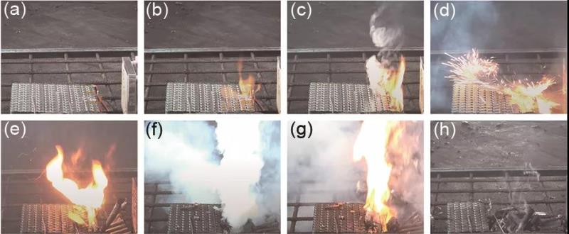 如圖6(a)所示,通過外加輻射熱源的方式對鋰電池組側(cè)面加熱,持續(xù)一段時間后,電池組距離熱源最近的一列電池最先著火,如圖6(b)所示,然后從右向左燃燒蔓延,在高溫火焰附近的電池芯安全閥被沖開,產(chǎn)生白色煙氣,如圖6(c)所示,同時伴隨著火花四濺的現(xiàn)象,如圖6(d)所示,這表示電池芯內(nèi)部的電解液被噴出。電池組表面火焰在蔓延過程中逐漸熄滅,此時未著火的電池內(nèi)部仍然在劇烈反應(yīng),此時可以觀察到大量白煙產(chǎn)生,如圖6(f)所示,這是電池芯內(nèi)部反應(yīng)產(chǎn)生的氣體,當(dāng)遇到高溫或火花或具有類似點火能量時,電池出現(xiàn)復(fù)燃,如圖6(g)所示,直至火焰完全熄滅,從試驗結(jié)果可以看到,當(dāng)鋰電池組側(cè)面過熱時,電池燃燒劇烈程度會隨著距離的增加而逐漸減弱,同時會多次出現(xiàn)斷續(xù)復(fù)燃的現(xiàn)象。
