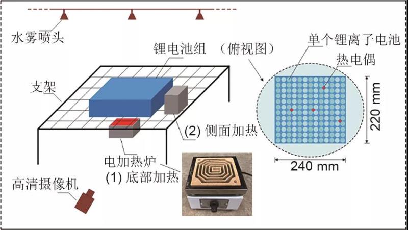 鋰電池在儲運和使用過程中,由于意外受熱可能造成鋰電池暴露在熱環(huán)境中而存在熱濫用風(fēng)險。試驗表明鋰電池?zé)崾Э氐牡刃R界溫度介于123.8~139.2 ℃。在過熱條件下,鋰電池內(nèi)部活性物質(zhì)增強(qiáng),容易引發(fā)電池材料間的化學(xué)放熱反應(yīng),導(dǎo)致內(nèi)部急速升溫超過臨界值,從而造成電池?zé)崾Э仄鸹?。為了模擬過熱環(huán)境,外部加熱是一種常用的試驗方法,可以加快模擬鋰電池的熱濫用過程。然而,文獻(xiàn)中多關(guān)注的是鋰離子單體電池在過熱條件下的熱失控特征及燃燒特性,對于模塊化電池組的熱濫用研究還比較缺乏,本文采用加熱爐模擬三元18650型鋰電池組熱失控后對相鄰電池的熱濫用過程,分析不同受熱位置和加熱功率條件下鋰電池組的燃燒特性和火災(zāi)行為,為三元18650型鋰離子電池的安全使用和高效滅火技術(shù)開發(fā)提供理論指導(dǎo)和數(shù)據(jù)支撐。
