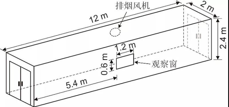 整個試驗在一個狹長受限空間中進(jìn)行,空間長12 m、寬2 m、高2.4 m,如圖2所示。受限空間縱向兩側(cè)設(shè)置有門,試驗期間保持關(guān)閉狀態(tài)。側(cè)面中間位置安裝有一個長1.2 m、高0.6 m的觀察窗,其對面墻的上側(cè)位置安裝有一個排煙風(fēng)機(jī),在試驗過程中開啟,保持通風(fēng)。受限空間頂部共安裝11個型號為2.5/1.5的水霧噴頭,即流量系數(shù)K=2.5 L/min/(MPa)1/2,設(shè)計工作壓力為p=1.5 MPa,設(shè)計流量q=9.7 L/min,霧滴直徑Dv0.99為138 μm,噴頭間隔1 m,用來開展水霧滅火測試,同時作為備用滅火降溫措施,防止火災(zāi)燃燒失控。