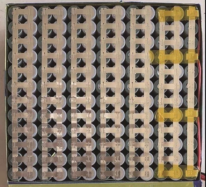 本文采用三元鋰離子電池組作為研究對象,電池組長240 mm、寬220 mm、高85 mm,重量為7 kg。電池組正常工作時電壓為48 V,額定容量30 A·h,內(nèi)部由156(12×13)個標(biāo)準(zhǔn)18650電池芯組成,單個電芯高65 mm,直徑最大18.4 mm,如圖1所示。試驗前,將電池組外包裝拆除,因為外包裝為阻燃材料,通過外部加熱無法引燃鋰電池。此外,內(nèi)部電路及電池管理系統(tǒng)保持不變,電池荷電狀態(tài)(SOC)均為100%。