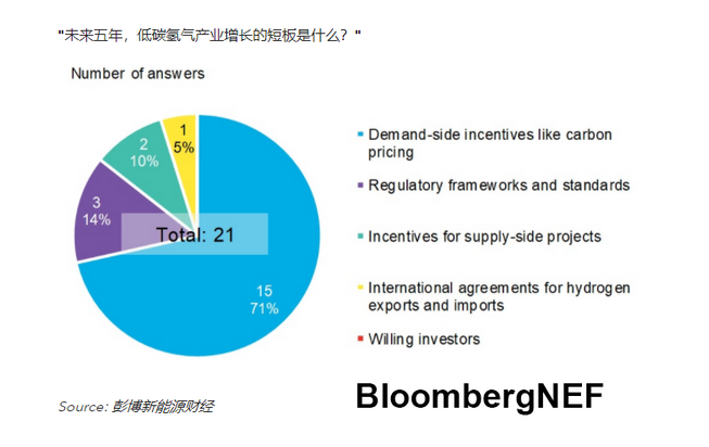 21個受訪者中有15人認(rèn)為,需求方激勵措施是低碳?xì)錃庠谖磥砦迥臧l(fā)展的關(guān)鍵缺失因素。與會者一致認(rèn)為,碳定價至關(guān)重要,但清潔氫氣目前需要100-200歐元(121-242美元)/噸的碳價支撐,才能在部分領(lǐng)域具有競爭力,相當(dāng)于目前歐盟碳價的2.5-5倍,與彭博新能源財經(jīng)《氫能經(jīng)濟(jì)展望》中的70-185歐元/噸的預(yù)測大致相當(dāng)。