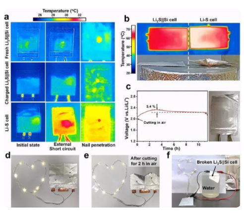 基于硫化鋰正極、硅負(fù)極與聚合物凝膠電解質(zhì)的準(zhǔn)固態(tài)鋰二次電池在(a)內(nèi)、外部短路、(b)過熱、(c)剪切后空氣靜置、(d)穿刺、(e)剪切暴露空氣、(f)剪切浸水等濫用條件下的安全性評估