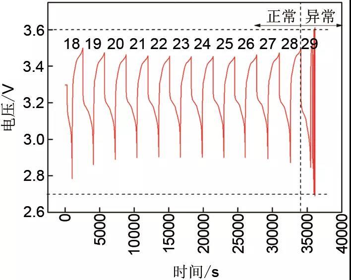 圖12為2號(hào)模組在第3次測(cè)試中的充放電電壓曲線,對(duì)比圖2和圖12可知在測(cè)試末期,電池包不能正常充、放電是由于2號(hào)模組出現(xiàn)異常。2號(hào)模組在充、放電循環(huán)中可在短時(shí)間內(nèi)達(dá)到充、放電的截止電壓,證明2號(hào)模組的容量在快速衰減,出現(xiàn)了微短路,診斷結(jié)果與實(shí)際結(jié)果一致。