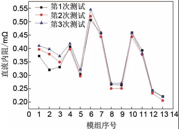 通過(guò)每次測(cè)試前靜置的電壓與充電電壓計(jì)算各模組的直流內(nèi)阻[11],直流內(nèi)阻計(jì)算公式為
