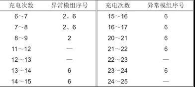 對(duì)于剩余的模組進(jìn)行Kn-n-1, j值一致性分析,各模組Kn-n-1, j值箱型圖如圖11所示。統(tǒng)計(jì)Kn-n-1, j值異常的模組序號(hào),如表3所示,1、2號(hào)模組出現(xiàn)異常,對(duì)比1、2號(hào)模組的直流內(nèi)阻可知,1號(hào)模組的直流內(nèi)阻較大,其Kn-n-1, j值異常是受到了直流內(nèi)阻的影響,且2號(hào)模組重復(fù)出現(xiàn)的次數(shù)最多,證明2號(hào)出現(xiàn)微短路。
