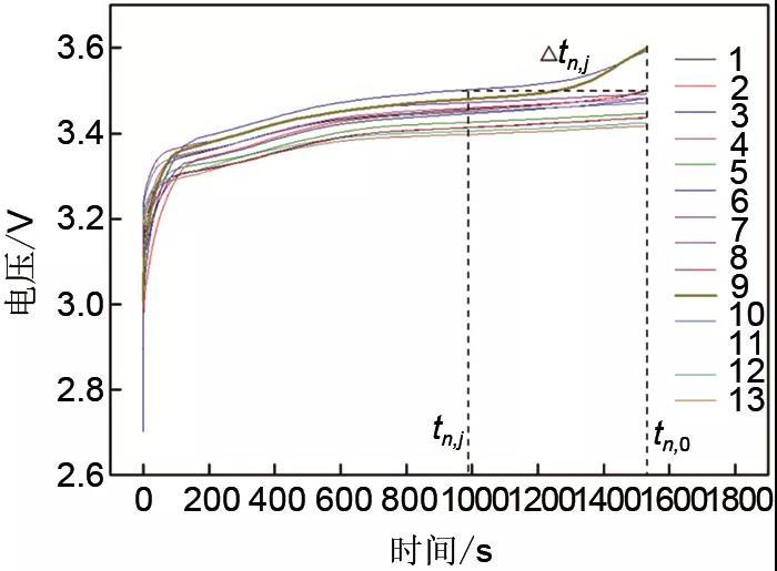 在電池包實(shí)際充電過(guò)程中,是無(wú)法對(duì)某一單體單獨(dú)充電的,因而充電結(jié)束時(shí)未達(dá)到充電截止電壓?jiǎn)误w的準(zhǔn)確剩余充電時(shí)間是無(wú)法得到的,但是可通過(guò)最先達(dá)到充電截止電壓?jiǎn)误w的電壓曲線為基準(zhǔn)獲取。在圖1中,以最先達(dá)到截止電壓的6號(hào)單體的充電電壓曲線為基準(zhǔn),通過(guò)電池包中其他單體充電結(jié)束時(shí)的電壓和基準(zhǔn)充電電壓曲線,可計(jì)算得到相對(duì)充電時(shí)間Δtn,j,表征該單體的剩余充電時(shí)間,計(jì)算公式為
