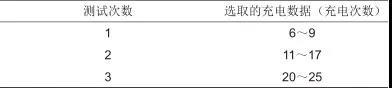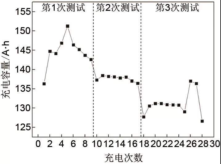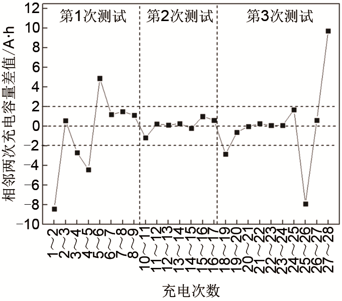 圖3為電池包在3次測(cè)試中每次充電容量,根據(jù)每次充電容量計(jì)算每次充電容量與后一次充電容量差值ΔC。3次測(cè)試中的充電容量差值曲線如圖4所示,縱坐標(biāo)為相鄰兩次充電容量差值,橫坐標(biāo)為對(duì)應(yīng)的相鄰兩次充電次數(shù)。在3次測(cè)試中,后2次測(cè)試過(guò)程中充電容量數(shù)值變化較小,ΔC基本保持在±2 A·h內(nèi)。以-2 A·h≤ΔC≤2 A·h為充電數(shù)據(jù)選取條件,并結(jié)合圖3和圖4,選取測(cè)試1中的第2、3、6~9次充電數(shù)據(jù)、測(cè)試2中的所有數(shù)據(jù)以及測(cè)試3中的第19~25、27次充電數(shù)據(jù)。