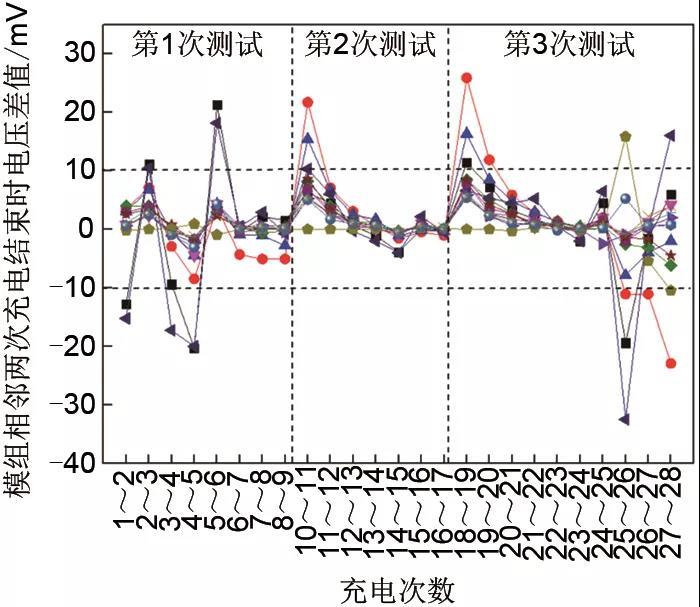 在分析電池包ΔC的同時(shí),對(duì)電池包各模組的ΔU進(jìn)行分析。圖5為電池包3次測(cè)試中每次充電結(jié)束時(shí)各模組的電壓曲線,可計(jì)算得到ΔU,各模組ΔU曲線如圖6所示。電池包的13個(gè)模組中,多數(shù)模組的ΔU不超過(guò)±10 mV,以-10 mV≤ΔU≤10 mV為充電數(shù)據(jù)選取條件,并結(jié)合圖5和圖6,選取測(cè)試1中的6~9次充電數(shù)據(jù)、測(cè)試2中的第11~17次充電數(shù)據(jù)、測(cè)試3中的第20~25次充電數(shù)據(jù)。