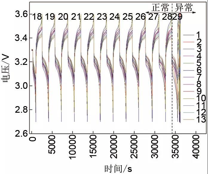 電池包在前2次測(cè)試中可以正常充、放電,在第3次測(cè)試后期不能充、放電。如圖2所示,在電池包第3次測(cè)試中各模組循環(huán)充、放電電壓曲線中,第29次充電后電壓曲線出現(xiàn)異常,由于電池包中的模組在短時(shí)間內(nèi)達(dá)到充電截止電壓和放電截止電壓,導(dǎo)致電池包不能正常充、放電。因此,選取電池包前28次的充電數(shù)據(jù)進(jìn)行分析,在28次充電數(shù)據(jù)中根據(jù)數(shù)據(jù)選取原則(1)~(3),選取符合的充電數(shù)據(jù)。
