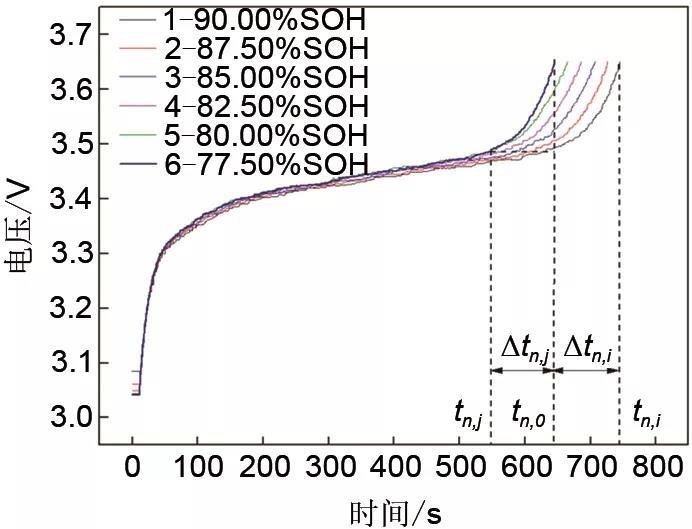 如圖1所示,其中6條電壓曲線為同一18650磷酸鐵鋰單體電池在不同SOH下的充電電壓曲線,其額定容量為1 A·h、額定電壓為3.3 V、充電截止電壓為3.65 V。將圖1中的6條充電電壓曲線模擬為1個(gè)電池包在某次充電的電壓曲線,該電池包由6個(gè)單體串聯(lián)而成,分別用1~6為其編號(hào)。