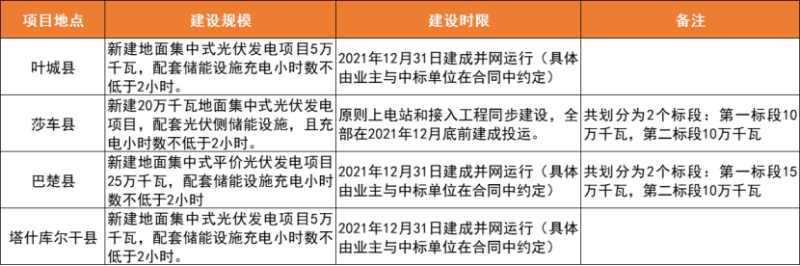 近日,新疆喀什地區(qū)葉城縣、莎車縣、巴楚縣、塔什庫爾干縣相繼發(fā)布2021年光伏發(fā)電和儲能設(shè)施項目競爭性配置工作招標公告,共計550MW,均為地面集中式光伏發(fā)電項目。光伏們整理了項目基本情況,如下圖所示: