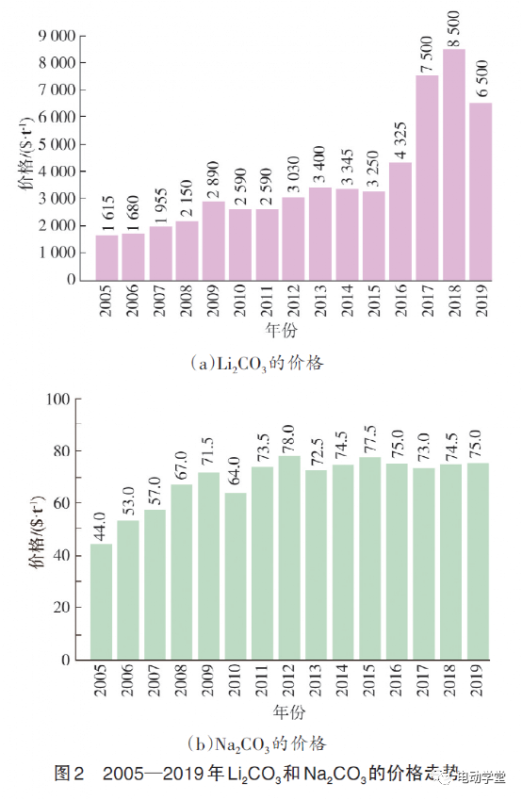 鋰離子電池和鈉離子電池的電極原材料可以分別由碳酸鋰(Li2CO3)和碳酸鈉(Na2CO3)的前驅(qū)體合成。因此,原材料的價格波動會對電池成本產(chǎn)生較大影響。Li2CO3和Na2CO3在過去15年的價格走勢如圖2所示。圖2中數(shù)據(jù)清楚表明,Na2CO3的價格比Li2CO3低約兩個數(shù)量級。2019年,Li2CO3的價格為6500$/t而Na2CO3的價格僅為75$/t。此外,兩種材料的價格趨勢也有所不同。2010年以來,Li2CO3的價格從2590$/t漲至6500$/t,漲幅為151%。同時期Na2CO3的價格僅從64$/t上漲到75$/t,漲幅為17%。Li2CO3較高的價格水平在很大程度上與鋰礦資源的地理位置有限有關(guān)。