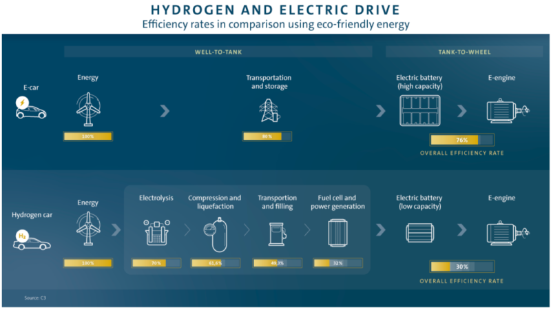 而氫動(dòng)力汽車的能量損失要大得多:在通過電解生產(chǎn)氫氣的過程中,已經(jīng)損失了45%的能量。在剩下的55%的原始能量中,當(dāng)氫在車內(nèi)轉(zhuǎn)化為電能時(shí),又有55%的能量損失了。這意味著氫動(dòng)力汽車的能源效率僅為25%至35%。