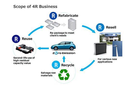 2010年,日產(chǎn)汽車與住友商事株式會(huì)社(Sumitomo Corp.)成立合資企業(yè)4R Energy株式會(huì)社(4R Energy Corp.),專注于電動(dòng)汽車電池的有效再利用,并通過開發(fā)技術(shù)和基礎(chǔ)設(shè)施,以4R模式(再制造(refabricate),再循環(huán)(recycle),再銷售(resell)和再利用(reuse)),發(fā)掘車載電池能量價(jià)值為其他設(shè)施提供電力。