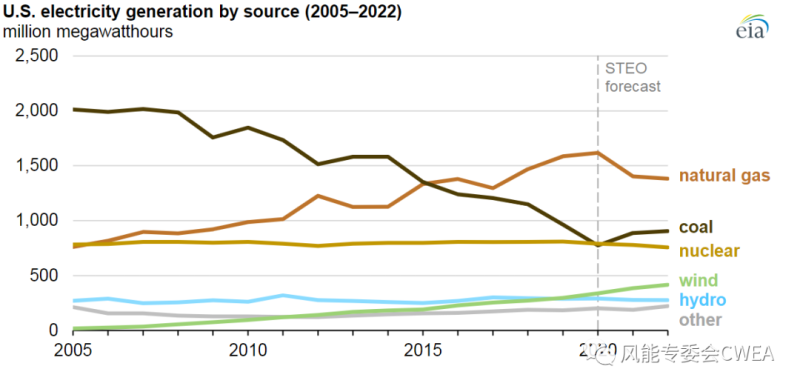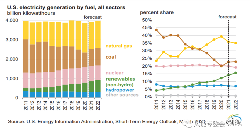 如果將風(fēng)力發(fā)電、太陽(yáng)能發(fā)電和水電合并到一起,可再生能源的發(fā)電量也已經(jīng)超過(guò)了煤電。但美國(guó)天然氣發(fā)電仍然處于領(lǐng)先地位。EIA展望報(bào)告顯示,到2050年,美國(guó)可再生能源發(fā)電占比將提升到42%,超過(guò)天然氣發(fā)電。CWEA