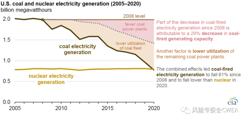 2005年以來(lái)煤電的實(shí)際快速下降趨勢(shì),資料來(lái)源:美國(guó)能源信息署